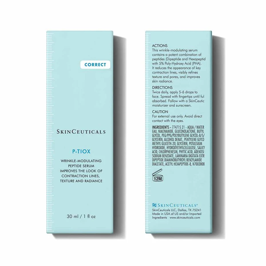 P-TIOX is a peptide-powered serum inspired by the effects of anti-wrinkle neurotoxin injections, proven to reduce the appearance of 9 types of expression lines and reveal glass skin radiance. This non-invasive, wrinkle-modulating serum features an advanced peptide complex amplified by synergistic actives (5% polyhydroxy acid, 5% niacinamide, and 1% laminaria extract) to visibly correct wrinkles, while improving the appearance of skin texture and radiance in just 1 week of use.